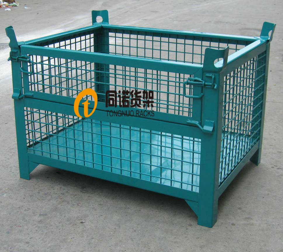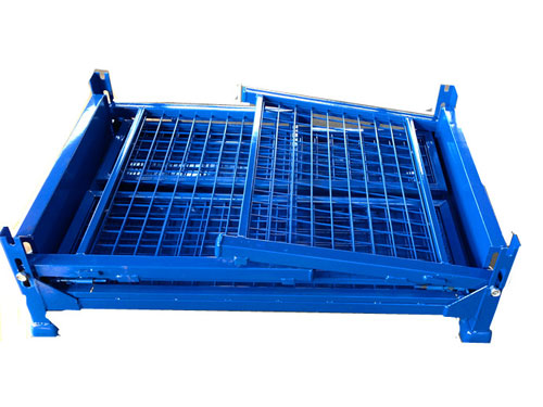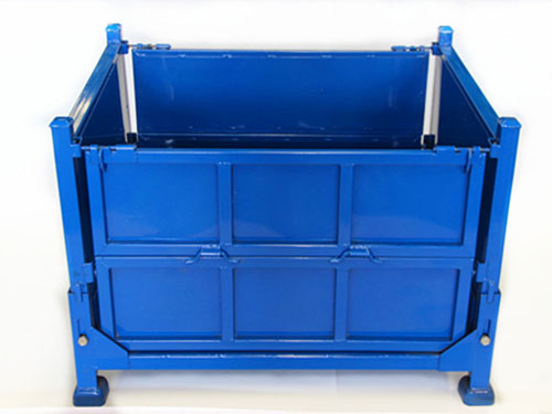 可折叠式钢制料箱是把料箱的结构设计成立柱可折叠式放置的结构,底架与立柱采用折叠装置,方便折叠运输,承载大,不变形。